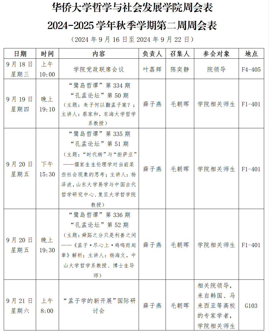 哲社学院2024-2025学年秋季学期第二周周会表
