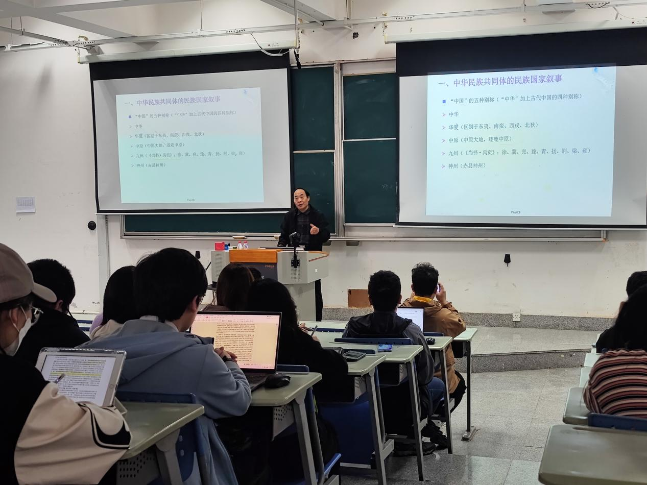 讲座开始,刘荣军教授基于中国历史的伟大叙事,详细介绍了中华民族概念的历史形成,同时指出“铸牢中华民族共同体意识”这一重大战略目的是让民族凝聚成国家,让人民成为主人,让人民和国家更加文明。随后,刘荣军教授从民族国家的叙事、人民国家的叙事以及文明国家的叙事三个维度出发,站在哲学的高度,结合“共同体”“现代国家”“现代化国家”“共和”“中国式现代化”“人类文明新形态”等热点议题,以宏阔的理论视野和深邃的历史眼光指出,中国式现代化是对“现代化”和“文明”的双重提升以及未来中国也将会从文明国家走向人类文明。
