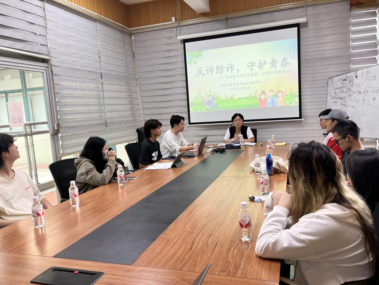 2024年4月23日下午14:30,哲社学院“反诈防诈,守护青春”暨境外生安全教育、心理健康教育、学业交流分享座谈会在哲社学院观书亭举办。我院团委书记鞠芳、实习辅导员张振泽出席本次会议,院学生会主席团成员郑燕茹、23级班助邹兵、22级优秀学生代表王烁为、叶嘉欣以及我院全体境外生与会。
