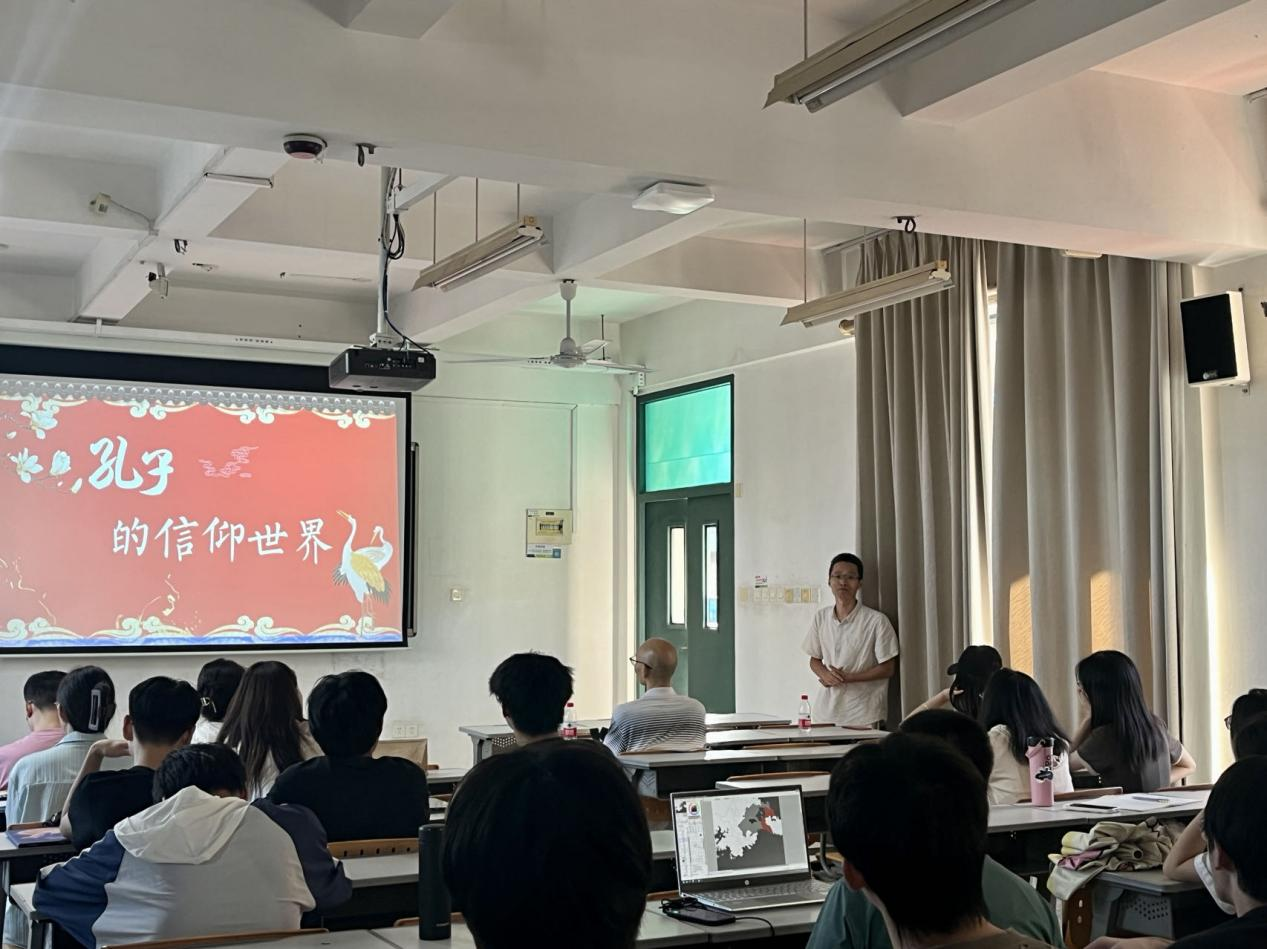 介绍完毕,杨中启先生开始他的讲座汇报。本次讲座中,杨先生结合西方现象学观点,从宇宙观、道德观、仁学实践三个方向展开讲述,分析了孔子及中国人传统的信仰观念。杨先生的讲座主要分为三个部分:一、形而上的依托。二、仁的展开。三、生命的体验。杨先生立足于孔子之天,展开对天命非宿命的讨论。阐述“道—天命—仁”这一过程的呈现与落实。同时在“仁”的践行中,感悟乐而忘忧、忧乐圆融的生命体验。最后,杨中启表示,我们要全面、深刻地认识祖国的传统文化,采取正确的态度,取其精华,去其糟粕,将优秀传统文化与现代文化相结合,使之与现代文明相协调,保持文化的民族性与优越性,彰显其时代性。