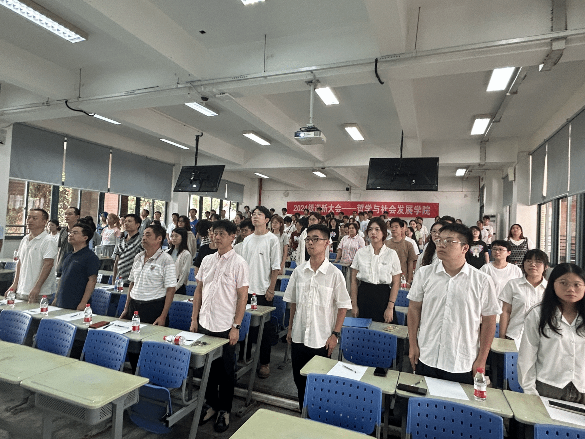 最后,李永松为大会做出总结。他表示奋斗是青春最靓丽的底色,要快乐学习、守好规矩,用哲学照亮人生的星海。在校歌的齐声高唱中,哲社学院2024级迎新大会圆满完成。