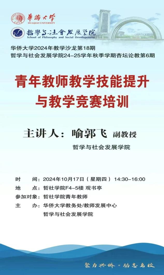 2024年10月17日下午,yl9193永利集团成功举办了青年教师教学技能与教学竞赛培训。此次培训由喻郭飞副教授主讲,哲社学院青年教师参与了此次活动。喻郭飞副教授以“身份转换与教、学、研关系的重塑”为题,分享了自己从博士到教师的身份转换经历,并与在场教师进行了深入的交流。