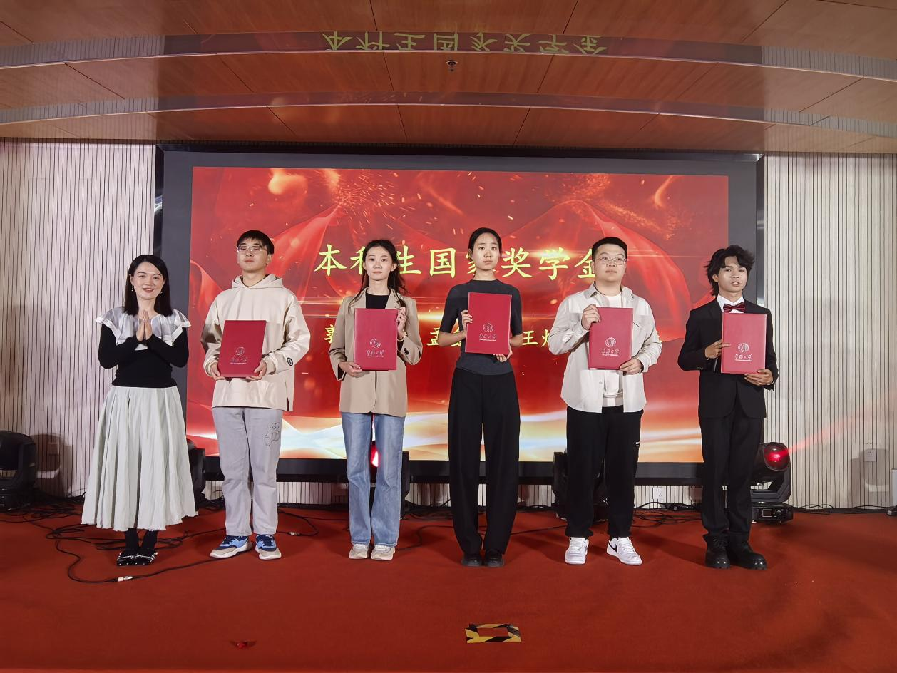 薛子燕为获得本科生国家奖学金的同学颁奖并合影留念