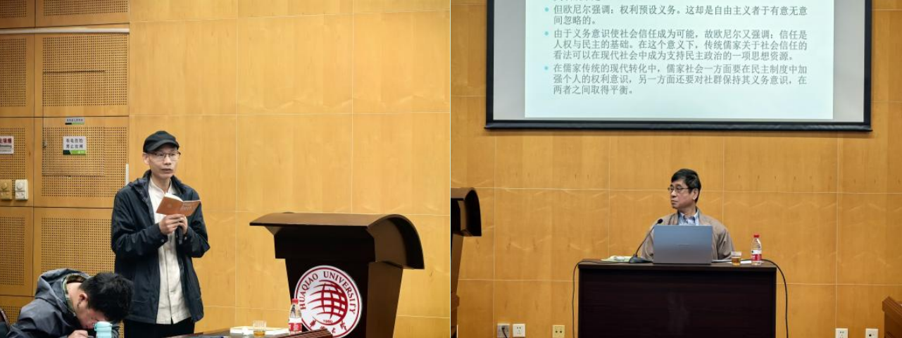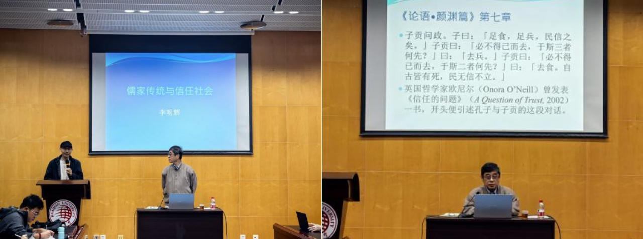 讲座伊始,李明辉教授首先由《论语·颜渊篇》中孔子所特别强调的“自古皆有死,民无信不立”一句,引入讲座主题。随后,他援引徐复观《释〈论语〉“民无信不立”》一文对该句话的涵义做了详细阐述。徐复观将历代对于“民信之”的解释归纳为三类。第一种诠释以郑玄注、皇侃疏为代表。“信”在此指人民自身之守信,“民无信不立”意味着“人民若不守信,则虽生犹死”。第二种诠释以孔安国与刘宝楠为代表。此处的“信”是指统治者之守信,故“民无信不立”即转换为“君无信则不能立”。第三种诠释以朱熹为代表。“民无信不立”则理解为“民无信则虽生而无以自立”。李明辉教授指出,徐复观取第二种解释而对朱熹的观点有所批评。他则认为,“民信之”的“之”字指涉“民”,此处的“信”指人民的守信与互信,即社会信任。因此,他认为第二种解释虽得到徐复观的首肯,但在语法上说不通。接着,李明辉教授从比较视野切入,藉由日裔美国政治学家福山和英国哲学家欧尼尔对社会信任问题的说法,分别从经济发展与民主政治两方面说明社会信任在现代社会中的价值与地位。