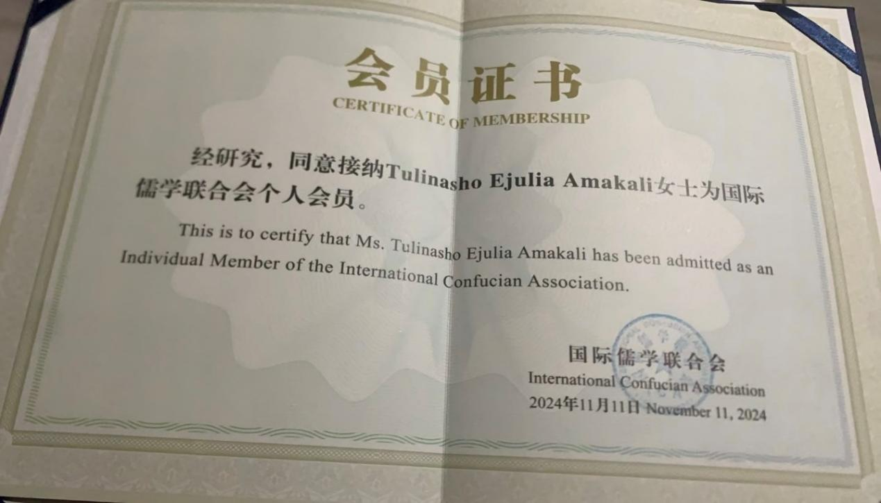 此次会议的成功举办,标志着国际儒学界在新时代背景下的进一步合作与交流,展现了全球学者对儒学文化的共同热爱与追求。大会结束后,我院纳米比亚博士生Tulinasho EJulia Amakali于2024年11月11日荣获国际儒学联合会(ICA)个人会员资格。ICA致力于研究和传承儒学及中华传统文化的核心思想,推动儒学的全球传播和实践,以及促进中华文明与世界其他文明的交流与互鉴,旨在构建人类命运共同体,推动世界和平与发展,以及人类文明的进步。Tulinasho EJulia Amakali 博士生的加入标志着她对于推广中华优秀传统文化和促进全球文明交流的个人承诺,也意味着她将在纳米比亚和全球范围内推动儒学的传播、实践和国际合作。