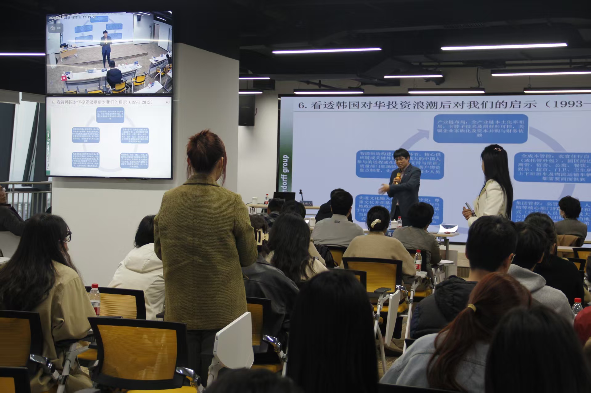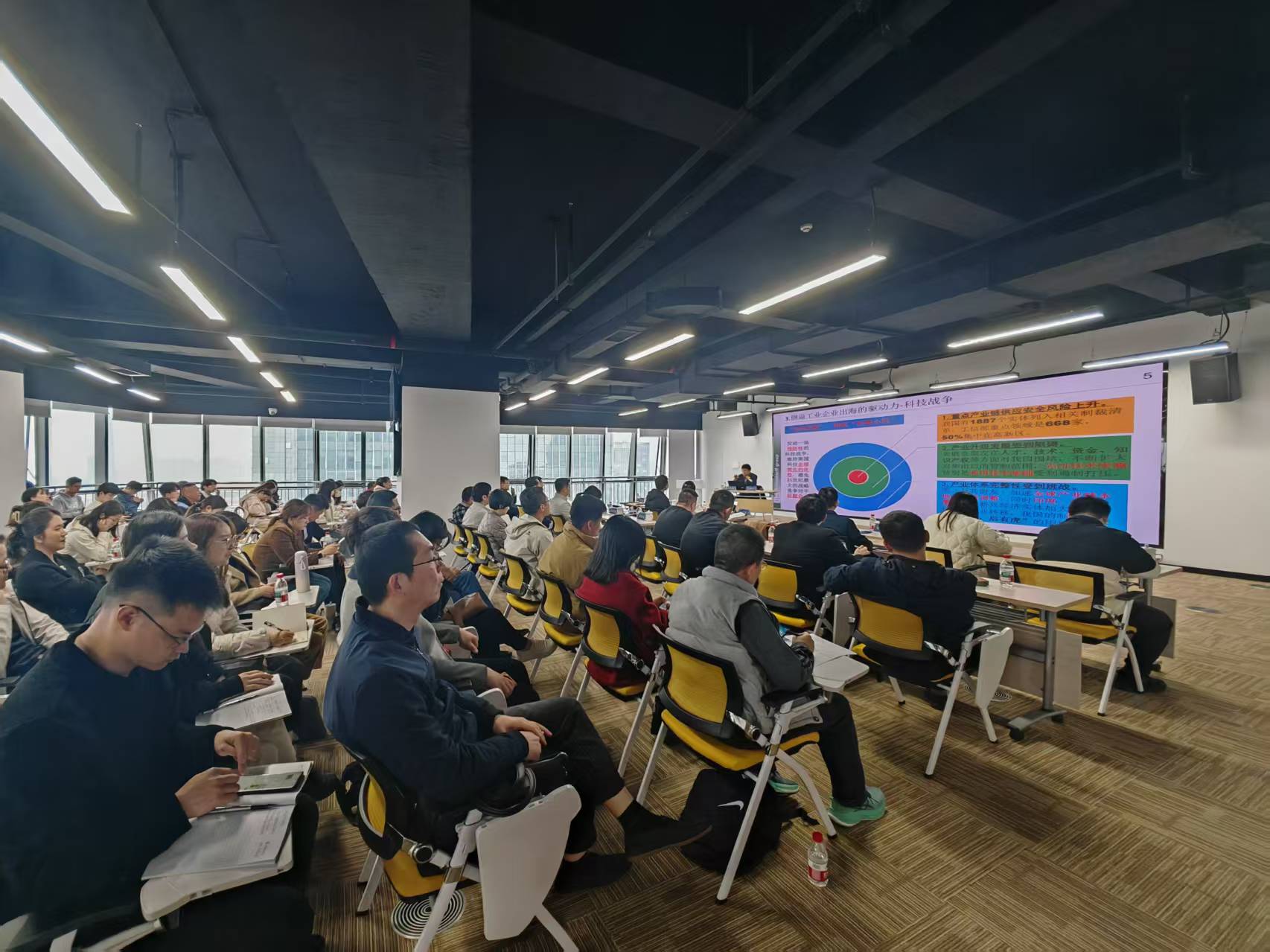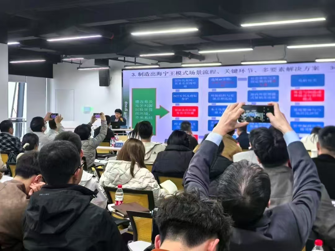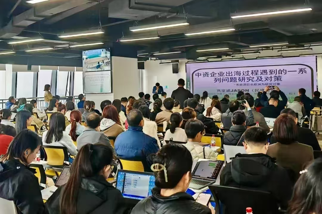 随后,巩家诚教授带来了题为《中资企业出海过程遇到的一系列问题研究及对策》的精彩讲座。在当下的世界经济格局中,新质生产力已成为企业出海进程里的关键要素,同时也是国家发展战略的核心内容。为深入学习贯彻习近平总书记关于新质生产力的相关论述,本讲座试图通过实践解读,探索其与出海企业的创新融合,推动新质生产力的形成。巩教授以深入浅出的方式,详细讲解了中资企业出海浪潮的背景以及国家强有力的政策支持,通过分享新能源巨头宁德时代和特斯拉在国际舞台上的发展历程,生动剖析了中资企业出海过程中面临的一系列问题,并提出了极具针对性的应对策略。他着重强调,中资企业在出海过程中,不仅要依靠自身力量积极应对困难,还要善于借助各类平台赋能,同时借鉴日韩美等国家的成功经验。此外,中资企业需具备结构性思维,主动拥抱海外市场。讲座结束后的现场问答环节将气氛推向高潮,各企业代表就出海发展涉及的政策、安全、文化等方面问题踊跃提问,巩家诚教授一一耐心解答,为企业出海发展提供了切实可行的建议,现场交流互动频繁,思维碰撞出耀眼火花。