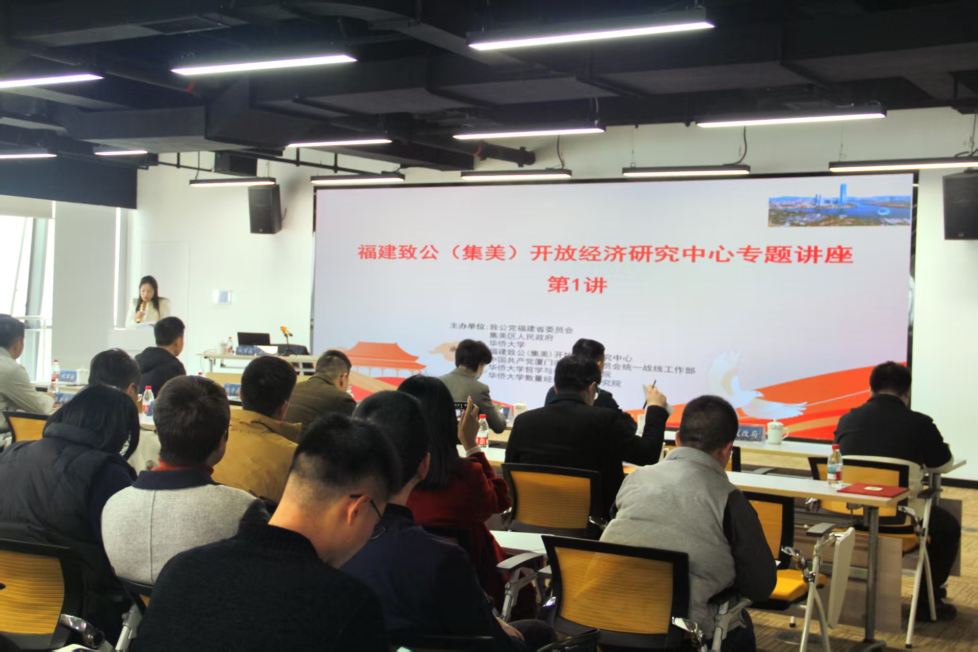 2025年2月26日,福建致公(集美)开放经济研究中心专题讲座第1讲在集美区国际合作中心会议室盛大启幕,现场气氛热烈非凡。在中共二十届三中全会精神以及习近平总书记在福建考察时的重要讲话精神的指引下,本次讲座旨在深入贯彻自由贸易试验区提升战略,以高水平开放引领高质量发展,积极推动内外需“双轮驱动”,促进“国内国际双循环”互动,助力集美区打造成为“大陆企业的出海口、海外企业的入海口”。