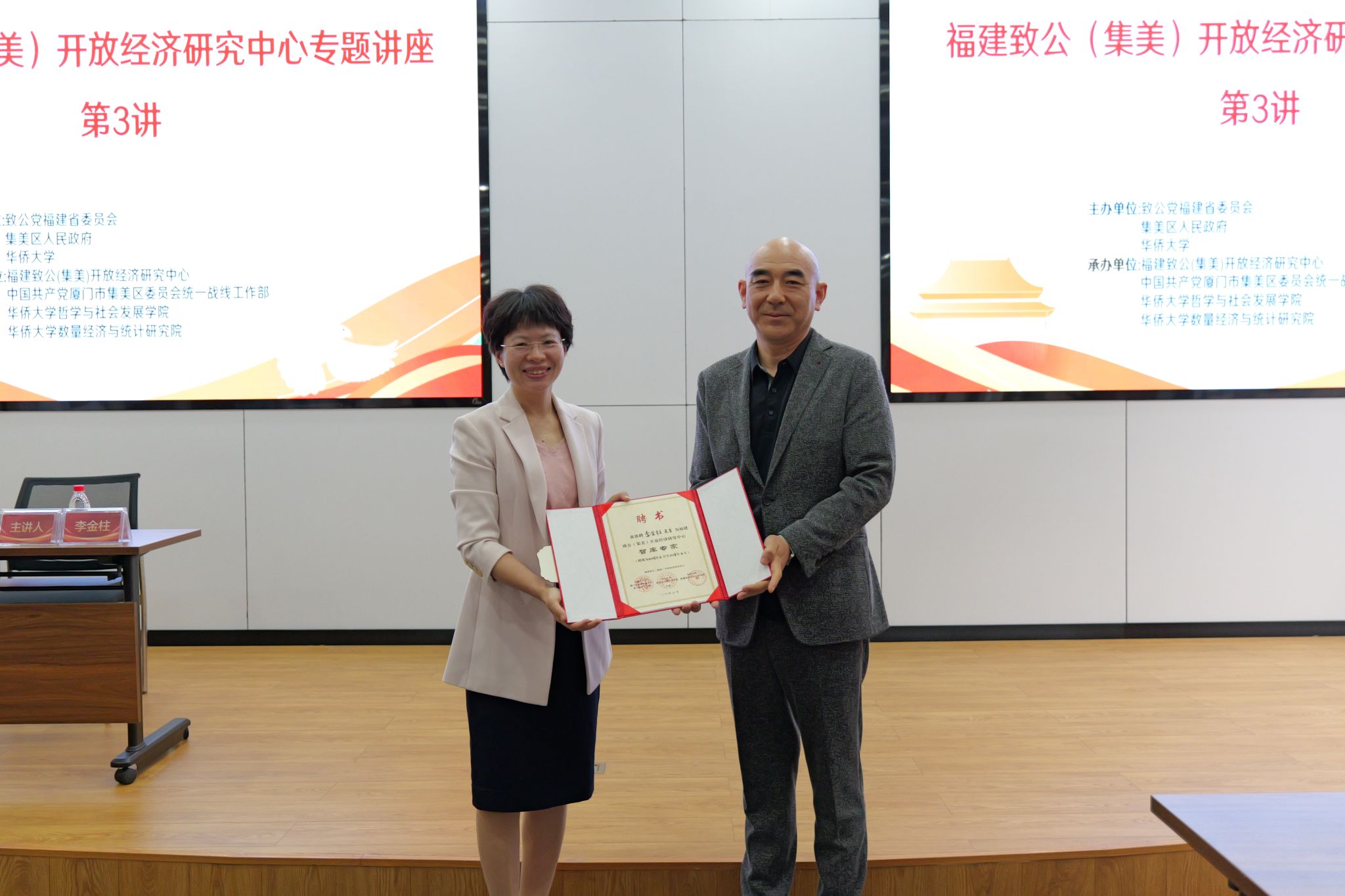 讲座伊始,集美区委常委、统战部部长江彩蓉为在企业应用新技术研究领域有着深厚专业积累和丰富实践经验的酷特C2M产业互联网研究院副院长李金柱先生颁发福建致公(集美)开放经济研究中心智库专家聘书。
