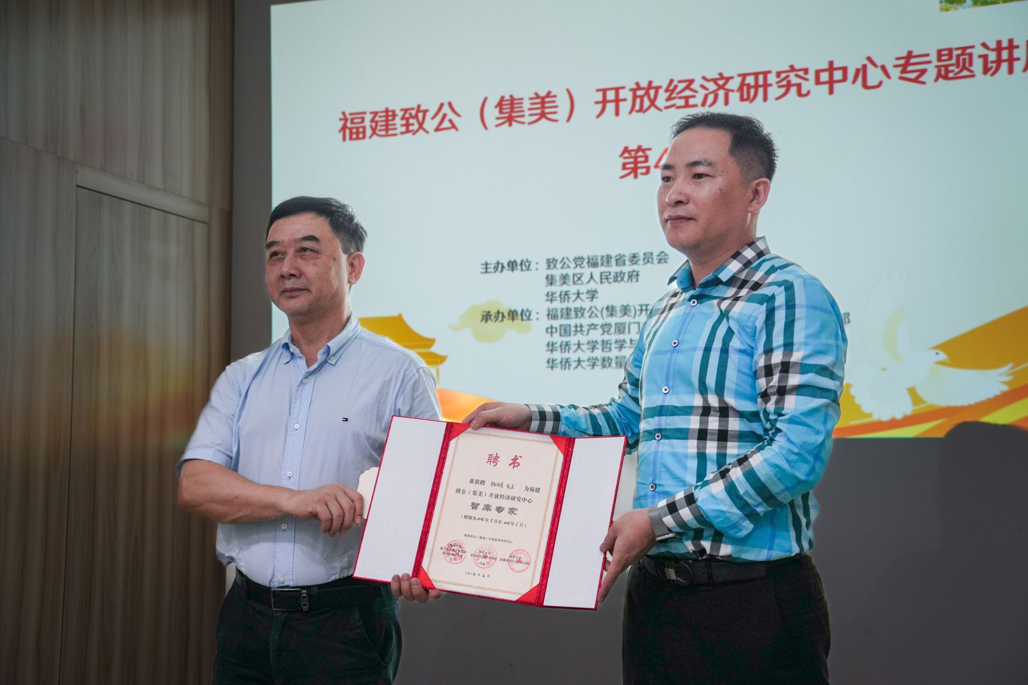 讲座伊始,集美区委统战部常务副部长、区侨办主任谢乐峰为深耕家居建材行业,兼具全球化视野与本土化实战经验的鲁丽集团鲁丽家居营销总监杨向东先生颁发福建致公(集美)开放经济研究中心智库专家聘书。