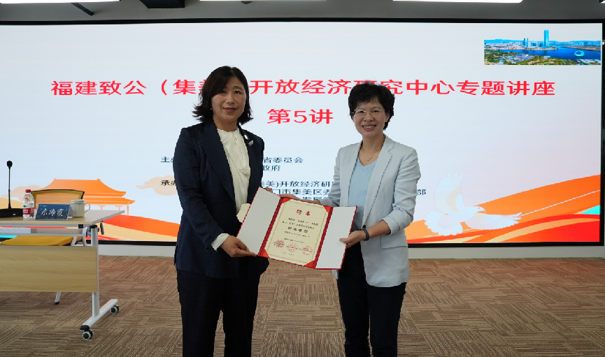 本次讲座全面贯彻中共二十届三中全会精神及习近平总书记在福建考察时的重要讲话精神,旨在推动自由贸易试验区提升战略的实施,通过高水平开放引领高质量发展。讲座开场,集美区委常委、统战部部长江彩蓉为中国致公党福建省委员会委员、福州市律师协会副会长、盈科律师事务所中国区执行副主任东海霞律师,颁发了福建致公(集美)开放经济研究中心智库专家聘书。