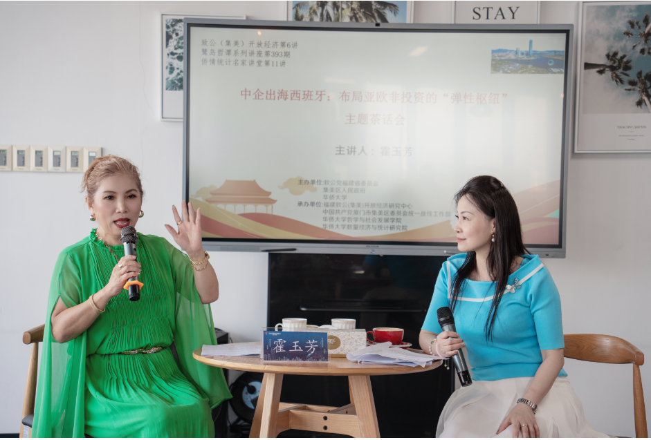 随后,讲座以“中企出海西班牙:布局亚欧非投资的‘弹性枢纽’”主题茶话会的形式展开,由yl9193永利集团党委书记、副院长、福建致公(集美)开放经济研究中心负责人叶荔辉担任主持,并对霍玉芳女士进行深度采访。双方围绕中企出海西班牙过程中的商会作用、政策优惠、市场切入点、跨文化沟通管理及企业落地等核心议题展开交流。霍玉芳表示,商会定位为“双向桥梁”,既能助力中国产品进入国际市场,也为西班牙企业落地中国提供全流程服务,还能对接多个区域政府资源,建议中国企业“走出去”时实地考察。以食品行业为例,强调产品需符合目标市场质检标准,通过建龙福工厂案例说明“组团出海、抱团发展”的优势。