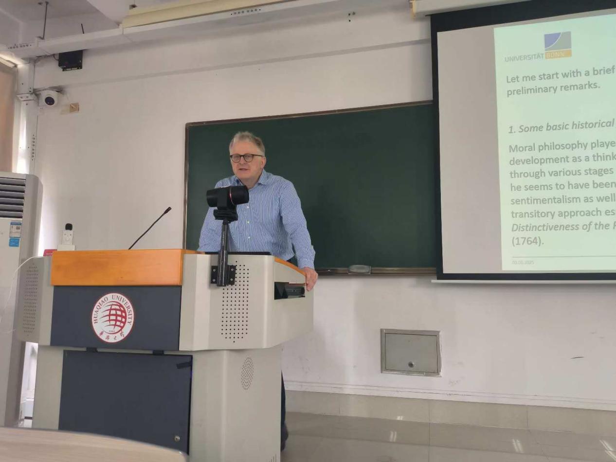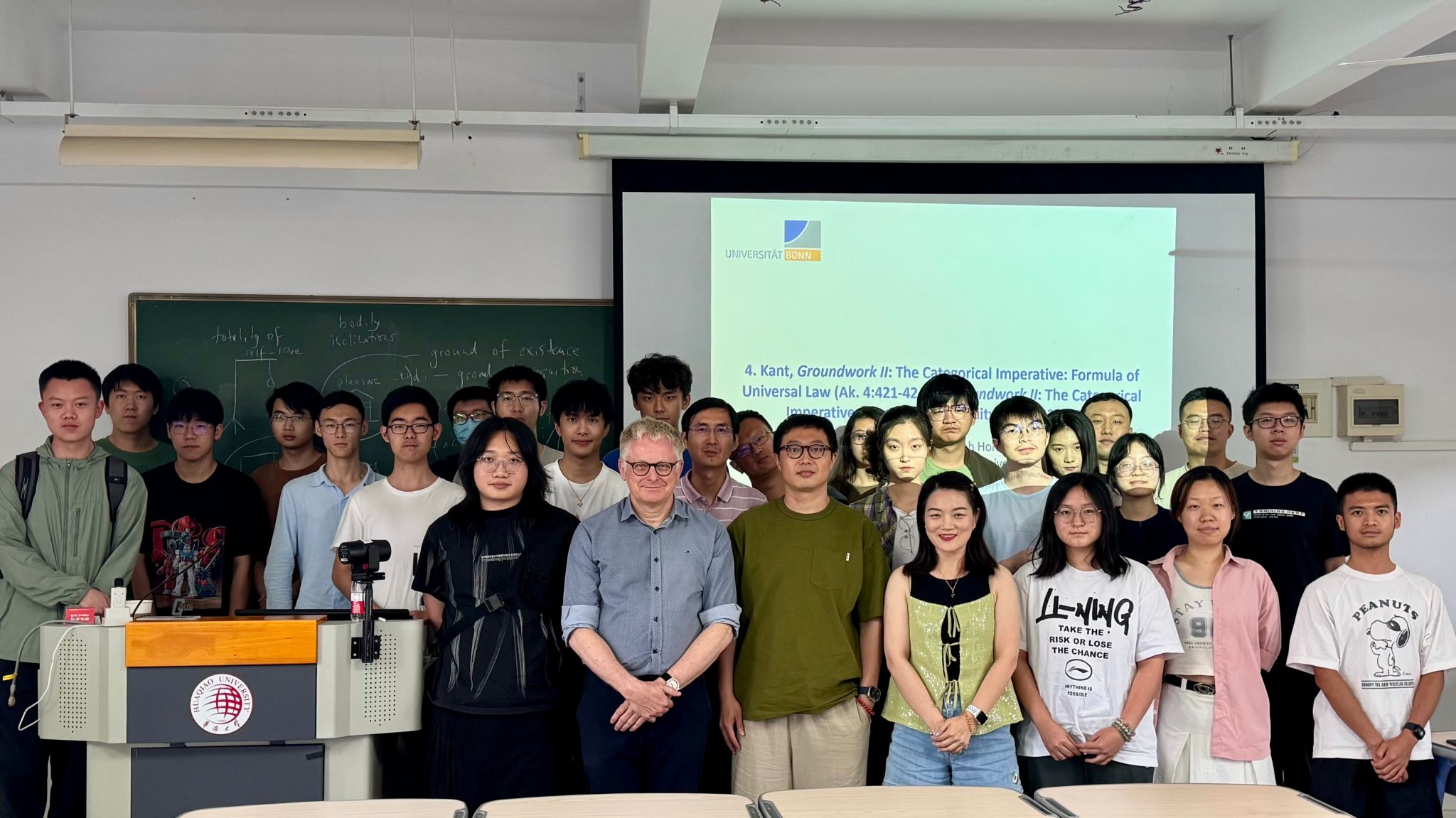 2025年6月9日至13日,德国波恩大学实践哲学与古代哲学讲席教授、巴登-符腾堡州科学院院士Christoph Horn教授应邀莅临我校yl9193永利集团,围绕康德的重要著作《道德形而上学奠基》和《实践理性批判》开展系列讲学活动。yl9193永利集团副院长薛子燕副教授,高来源教授、周炼博士以及2021级、2022级本科生和部分研究生30余人参加讲座,喻郭飞副教授与王大帅博士担任主持人。