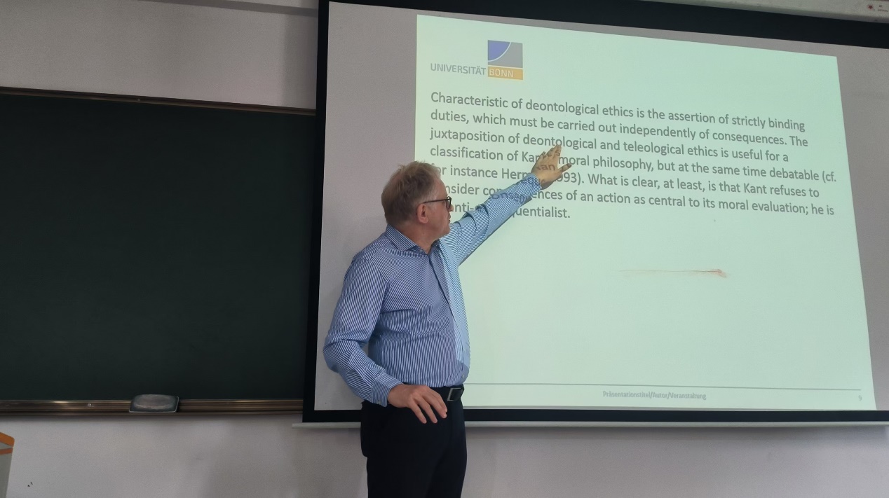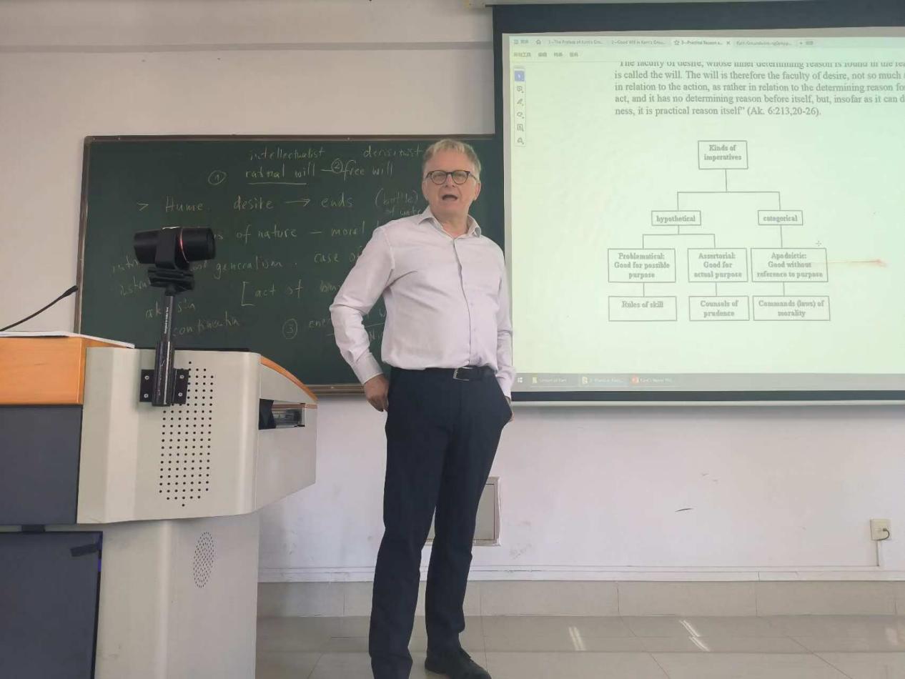 在系列前半部分的多次讲座中,Horn教授首先强调了康德对传统伦理学的颠覆:当完美主义陷入自我完善的循环,康德以“纯粹实践理性”划清自然法则(描述性必然)与自由法则(规范性应然)的界限。“士兵坚守阵地”的案例彰显理性对生物本能的超越——若受自然法则支配、士兵早该溃逃求生。《道德形而上学奠基》的“序言”暗含了康德伦理学的方法论蓝图:通过概念分析剥离经验杂质(第1-2章),再以综合命题嫁接自由与道德(第3章),为道德形而上学奠定先验根基。在此基础上,Horn教授聚焦“善良意志”作为唯一无限制之善的本质。对比才能、财富等情境依赖性的善(如身体健康在战场中反成负累),善良意志的价值自足性体现为“纵使无力实现目的、仍似宝石自耀”。通过剖析商贩的精明算计与慈善家的情感冲动,论证唯当行动纯粹为义务而义务(如“放弃考试跳湖救人”案例),行动的道德价值得以显现,此即定言命令对经验动机的根本净化。继而,Horn教授解析康德对意志的重构:继承柏拉图《高尔吉亚》的“理性意志”概念(依据法则表象行动),区别于尼采的“权力意志”的欲望扩张。核心案例“怀盗念者避银行职”虽呈假言句式、实为定言命令——因其通过普遍化检验且守护人性尊严。进而区分两类实践命令:假言命令依附经验目的(如“为健康而运动”),定言命令则确立绝对道德律令,彰显意志的自律本质。