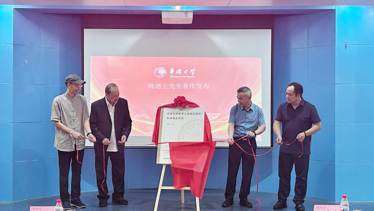 接着,陈迺士先生著作宣发仪式举行,永利集团国际儒学研究院院长杨少涵教授作为导师介绍,陈先生秉持“活到老学到老”精神,读博时将全球贸易实践与学术研究深度融合,研读文献字斟句酌,田野调查躬身实践。其论文及成果蕴含对华侨华人研究的深刻洞见,既为相关领域提供珍贵实证资料,又以严谨治学态度为青年学子树立学术探索典范。许志勇副校长和陈迺士先生、黄须友编审、杨少涵教授共同为陈迺士先生新书发布揭幕。随后,《心系乡国:陈迺士回忆录》编纂工程启动,该书由哲社学院牵头,计划梳理陈先生白手起家、反哺乡国的人生轨迹,以榜样力量激励青年学子。许志勇副校长和陈迺士先生、毛朝晖教授共同为这部回忆录编撰启动揭幕。