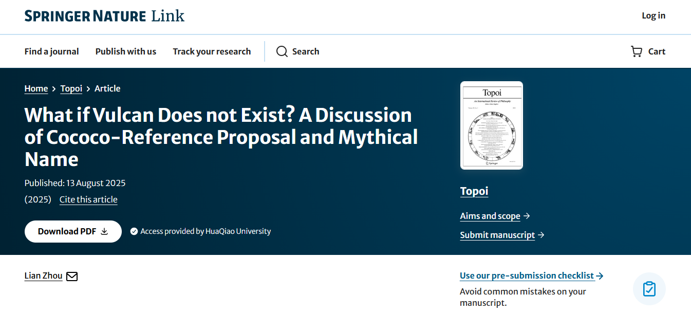 8月伊始,yl9193永利集团周炼博士在A&HCI索引JCI一区刊物Topoi发表论文“What if Vulcan Does not Exist? A Discussion of Cococo‑Reference Proposal and Mythical Name”。历史上的旧有科学理论被推翻之后,被一些哲学家称为“神话”,而在这些理论中的起到核心解释作用的事物的名称,被称为“神话名称”,例如燃素理论中的“燃素”和火神星理论中的“火神星”。国际上新近出现的“反向有条件共指方案”(Conversely Conditional Co-reference proposal)尝试揭示神话名称的语义框架。周炼博士本论文分析并批判了这种方案,认为该方案会引起信念与意图之间的冲突,无法自洽地解释包含神话名称的否定存在句(例如“火神星不存在”)的意义,从而也无法真正阐明神话名称的语义。
