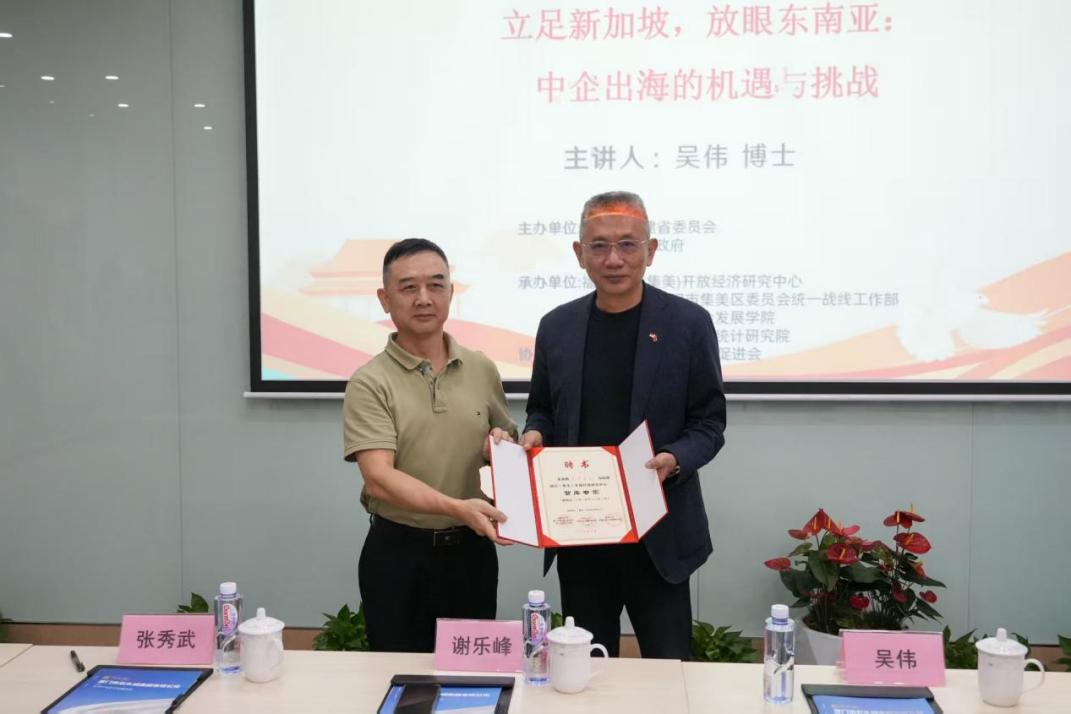 本次讲座特别邀请到了在中企出海以及企业全球化布局领域经验丰富的新加坡南洋理工大学南洋公共管理研究生院创院院长、新中经贸科技文教交流协会会长、全球跨境商务协会会长吴伟博士担任主讲嘉宾。活动伊始,集美区委统战部常务副部长、区侨办主任谢乐峰先生为吴伟博士颁发了福建致公(集美)开放经济研究中心智库专家聘书。