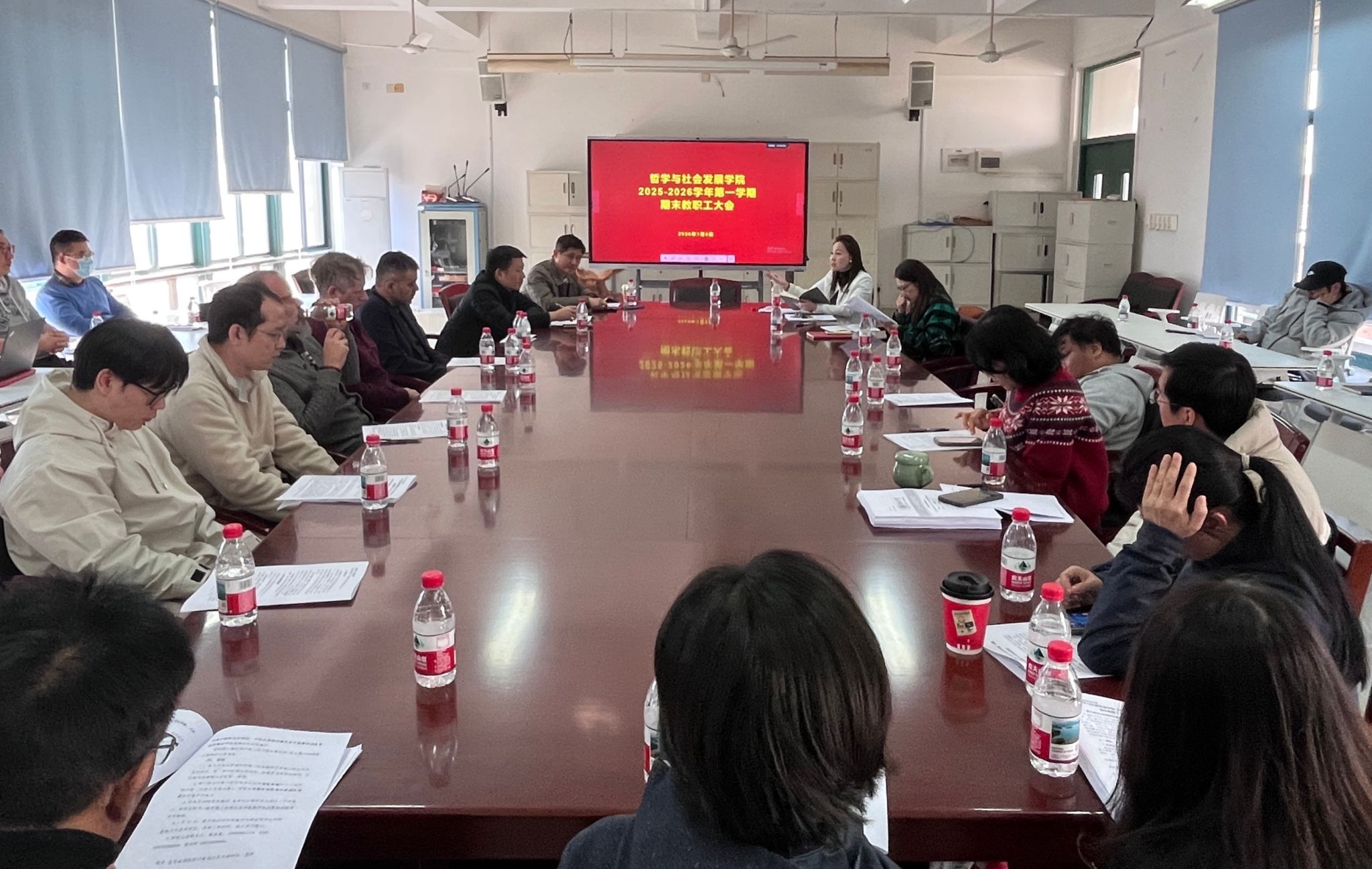 1月8日下午,yl9193永利集团于F1-401会议室召开2025-2026学年第一学期期末全体教职工大会暨师德师风教育专题会议。会议系统总结本学期工作,统筹安排假期及下学期重点任务,并聚焦师德师风建设开展了深入专题教育。学院领导班子成员及全体教职工参会,会议由学院党委书记、副院长叶荔辉主持。