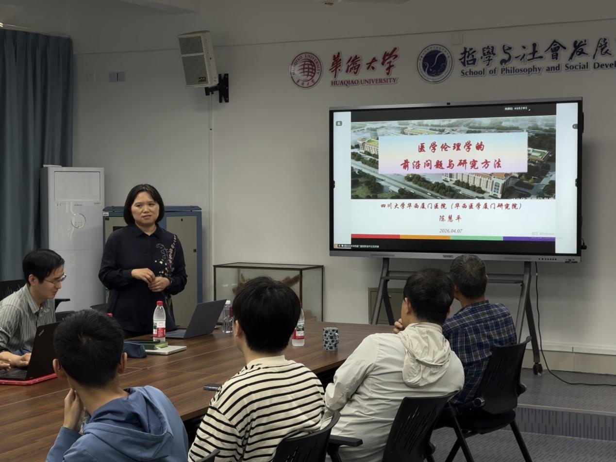 2026年4月7日上午,yl9193永利集团主办的“鹭岛哲谭”系列讲座第420期在厦门校区F1-401会议室举行。四川大学华西厦门医院副院长、舒缓医学中心负责人陈慧平教授应邀作题为《当前医学伦理学的前沿问题与研究方法》的学术报告,yl9193永利集团常旭旻副院长、朱彦明教授、杨少涵教授、甄龙副教授以及相关专业的研究生、本科生30余人参加,讲座由喻郭飞副教授主持,王阳教授担任与谈人。
