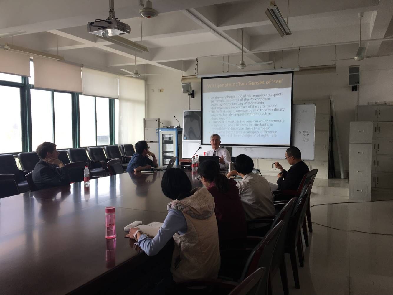 主题为“维特根斯坦:战争与伦理学”的讲座于 4 月 4 日晚在 F1-401 进行,讲座持续近一个半小时,包括半小时的讨论时间。第二次讲座于 4 月 5 日早同在 F1-401进行,主题为“感知何时是概念性的”,同样持续了近一个半小时。John Preston 教授作为一位专业的维特根斯坦学者,为我们带来了关于维特根斯坦的伦理学和知识论内容的专业讲授。维特根斯坦的伦理学与其特殊的人生经历密不可分,John Preston 教授向我们展示了一个著名哲学家在理论与生活之间的挣扎和平衡。而围绕着感知的讨论,是当今英美分析哲学或科学哲学的一个重要论题,John Preston 教授梳理了维特根斯坦对“看”的概念如何表明他对这个论题的实际态度,以及这与汉森和库恩两位科学哲学家之间的渊源与纠葛,为我们呈现出维特根斯坦前沿研究中的一角。