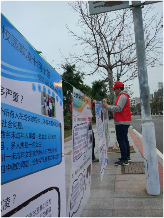 2017年3月以来,由yl9193永利集团社会学系7名同学组成的挑战杯“校园欺凌课题组”利用他们的调研成果服务学校和社区,在永利集团、厦门市高林小学、霞光小学、海沧中学和厦门市金安社区陆续开展预防校园欺凌宣传活动。