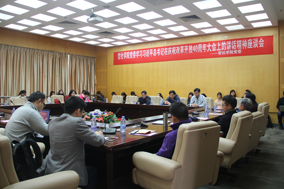 座谈会上,12位教师和3位学生代表先后发言,畅谈了自己学习习近平总书记的讲话、回首四十年改革开放的心得体会。院长许斗斗教授认为,这次的讲话不仅肯定了改革开放40年的成就,而且总结了“九个坚持”的基本经验,这些基本经验涉及到马克思主义哲学的实践的观点、群众史观、发展的观点等,既是对过去经验的总结,也是对未来发展的借鉴,不仅对中国未来发展有借鉴意义,也对世界未来发展有借鉴意义。徐冠岳副书记从个人生活的变化出发,谈自己亲身经历改革开放发展历程的体会,他认为,改革开放是社会主义的自我完善,要坚持正确的方向、道路,实现改革与开放的相互促进,共同发展。副院长李忠伟教授从历史与现实、主体、思想和实践三个维度谈了自己的感想,认为伟大的实践需要伟大的思想,伟大的思想指导伟大的实践,共产党人要回答时代之问,就要立足实践不断坚持和创新马克思主义,并以马克思主义不断去指导发展的实践。周世兴教授认为,习近平总书记的讲话把改革开放放在百年中国梦的大的历史框架下去理解和把握,能更好地把握改革开放的历史地位和重要影响,发展21世纪的马克思主义就是要更好地学习、理解和推进习近平新时代中国特色社会主义思想的丰富完善。马雷教授从代表论、知识分子论、问题论三个角度谈自己对习总书记讲话的理解和对改革开放40年变化的感受,并特别强调在推进改革开放中具有问题意识、坚持问题导向的重要性。刘荣军教授从政治哲学的视角出发,阐释了自己对习总书记讲话中提到的改革开放“伟大觉醒”和“伟大革命”的理解,分析了改革开放对推进中国特色社会主义现代化的重要意义和影响。范正义教授从宗教海外传播和影响的角度谈了扩大对外开放、对外传播中华文化、提升中国海外影响力的意义和作用。王阳教授分析了40年改革开放中中国科技创新水平不断提高及其对经济社会发展的重要影响,认为未来进一步推进改革开放,关键还是要不断提高科技创新能力。郭荣茂副教授从社会学的角度分析40年改革开放取得的成就和存在的需要进一步解决的问题,认为只有加强党的领导,才能更好地解决这些问题。刘守政副教授结合自己和家人的经历,谈改革开放40年发生的巨大的变化和取得的巨大的成就,认为推进改革开放正如习总书记讲话中所强调的那样,信心、信念和信仰非常重要。黄晓瑞副教授总结了改革开放40年中国社会保障事业取得的成就,强调在改革开放中坚持以人民为中心的发展至关重要。魏燕侠教授从解放思想与改革开放的关系入手,强调改革开放只有进行时,没有完成时,改革开放永远在路上。研究生第一党支部卢文军同学从自己经历的家乡交通、上学等的变化谈自己对改革开放的切身体会,认为改革开放应像习总书记在讲话中强调的那样,要一棒接着一棒跑下去。研究生第二党支部吕嘉兴同学从考试、工作、收入、出国、辞职五个方面对比了自己和自己的父母两代人的不同选择和境遇,强调改革开放给每个普通人的生活都带来了重要的变化,给了每个人更多的发展机遇。本科生支部李思佳同学从自己亲身经历的生活变化谈改革开放取得的成就,认为作为21世纪的当代大学生在进一步推进改革、扩大发展中应主动担负更大的历史责任。