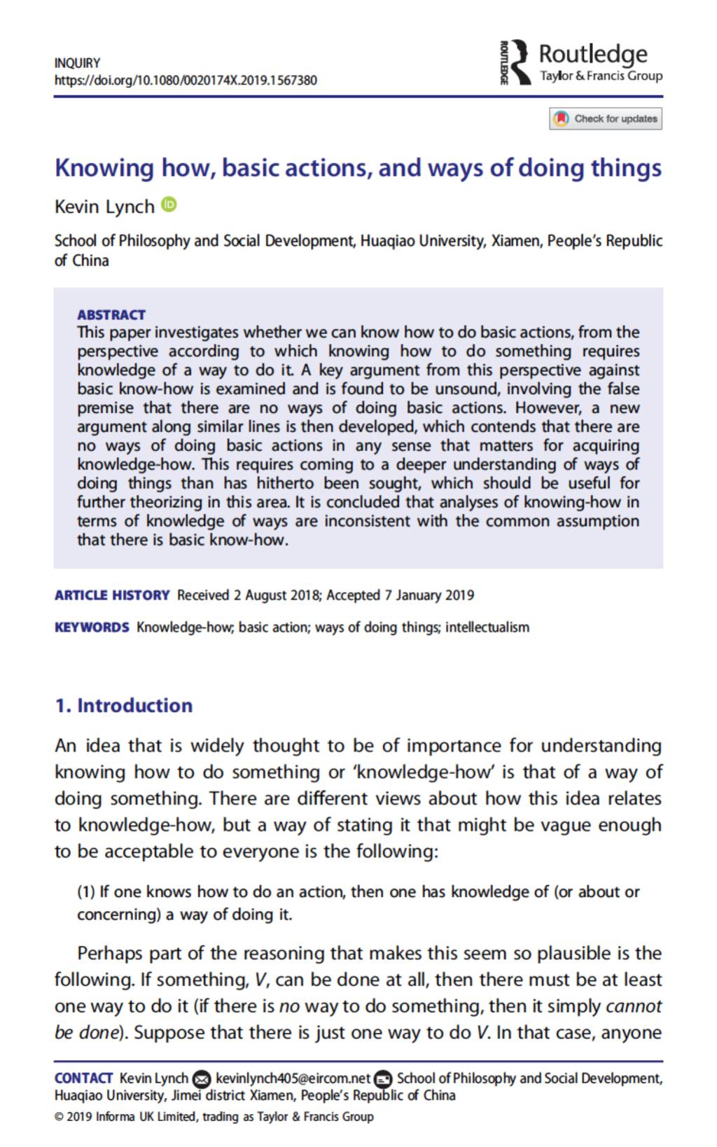 近日,永利集团哲学与社会学院外籍教师林奇(Kevin Lynch)副教授在国际重要期刊《探索》(Inquiry)(A&HCI)上发表题为“知道如何、基本行动和行事的方式”(Knowing how, basic actions, and ways of doing things)的文章。《探索》(Inquiry)是著名出版社劳特利奇出版的双月哲学期刊,也是国际上众多论文索引的期刊来源,包括《艺术与人文索引》(A&HCI)、《社会科学索引》(SSCI)等。这是林奇副教授入职永利集团后在国际重要期刊发表的第三篇论文,前两篇论文(均为A&HCI)分别发表在牛津大学出版的《分析》杂志(Analysis)和《加拿大哲学杂志》(Canadian Journal of Philosophy)上。