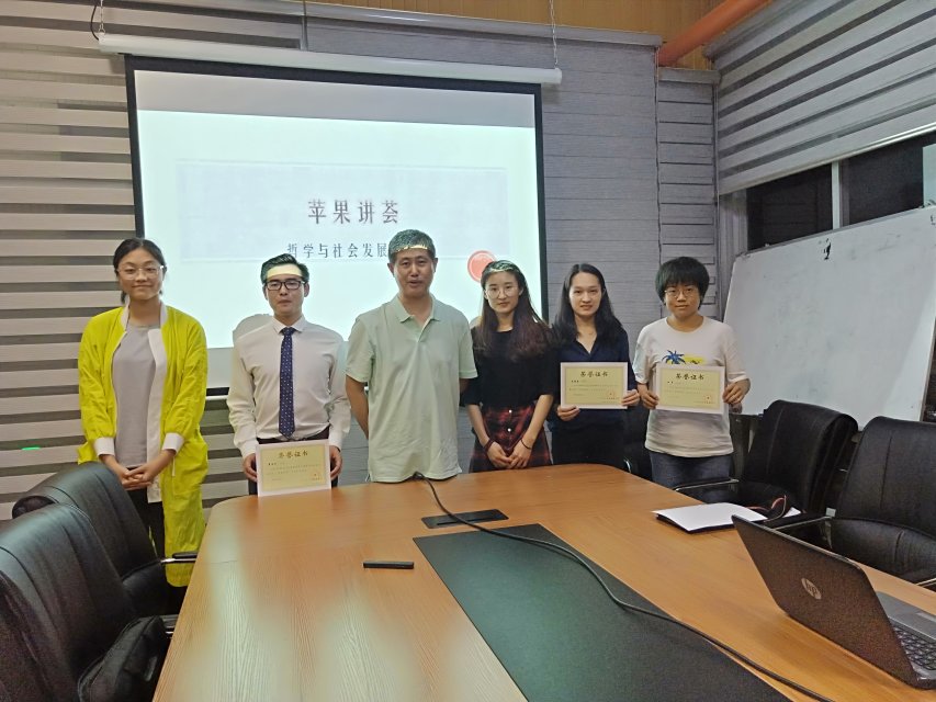 最后,由常旭旻进行了本次讲荟的获奖者颁发证书并合影留念。此次的苹果讲荟既有每个同学精彩的展示,又有老师细致入微的点评,活动十分成功。据悉,“苹果讲荟”是为提高研究生论文写作与演讲水平而举办的论文讲评活动,现已举办和开展多年,有一定影响力,并得到同学们的广泛参与。