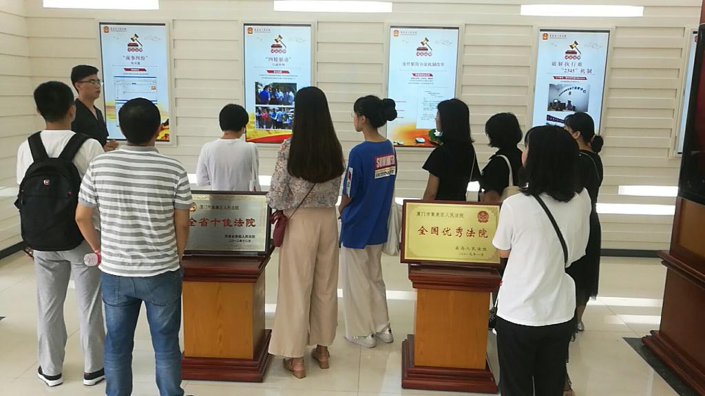 在集美区人民法院政治处工作人员引导下,支部全体成员首先参观了位于法院办公区的主题陈列厅,该主题陈列厅通过各类展板、橱窗、实物和电子设备,全面地展现了集美区人民法院在党建、反腐倡廉、法制建设等方面开展的工作、取得的成果及获得的荣誉,支部成员认真听取工作人员有关“社会主义法治体系建设”的介绍,并就大学生在日常学习生活中如何更好的树立“学法知法守法用法”意识进行了交流。