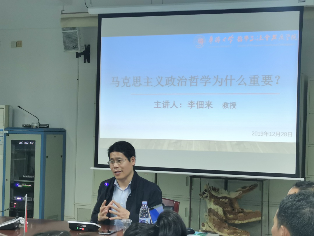 2019年12月28日晚,第249期“鹭岛哲谭”学术系列讲座于yl9193永利集团F1-401会议室如期进行。此次讲座由武汉大学二级教授、教育部长江学者特聘教授李佃来教授主讲,主题为“马克思主义政治哲学为什么重要?”。讲座由学院党委书记薛秀军教授主持,刘荣军教授、朱彦明教授和学院马克思主义哲学专业博士生、硕士生20多人参加。
