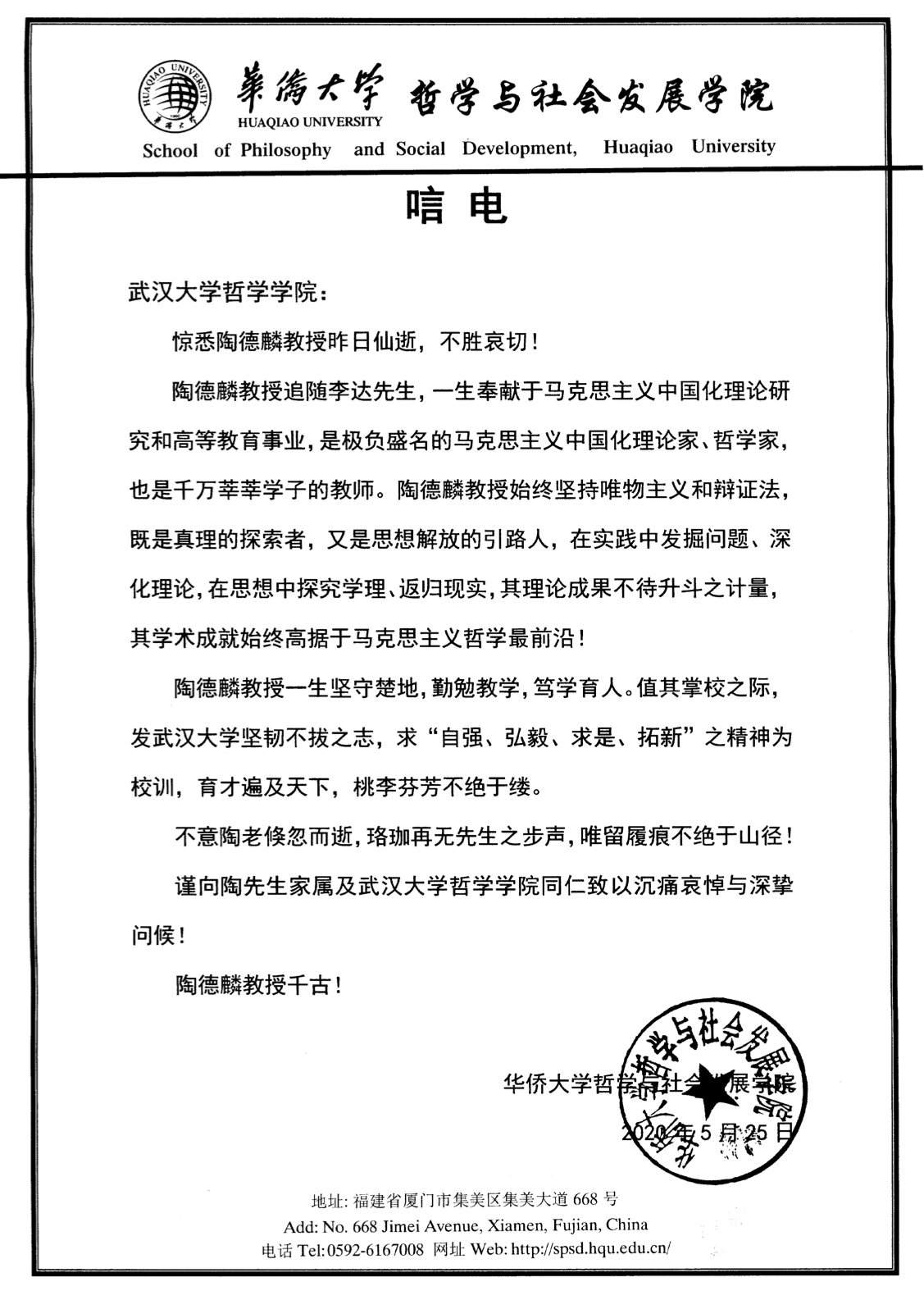 我院致哀著名哲学家、武汉大学原校长陶德麟教授