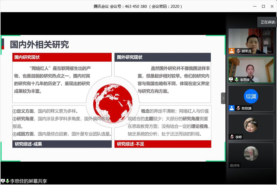 6月3日晚,二次答辩暨优秀毕业论文答辩于腾讯会议举行。侯雨佳同学的论文《COVID-19疫情背景下家庭对中学生线上学习效果影响机制研究---以宁武县X中学为例》获得今年学校优秀本科毕业论文推荐资格,吴钟淦同学的论文《当代“粉丝”的身份认同建构研究---以朱一龙粉丝群体为例》获得学院优秀本科毕业论文推荐资格,指导老师均为黄晓瑞副教授。