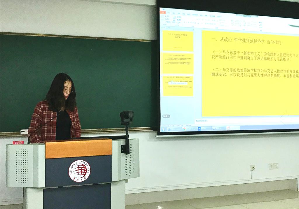 在汇报中,朱欢欢同学就“马克思人性理论”展开逻辑的梳理。该同学指出,马克思科学化的人性理论的形成有其学科上的逻辑关联,其逻辑理论遵从从宏观领域的政治-哲学批判到微观领域的经济学-哲学批判再到人类学-历史学批判的研究思路,奠立于“革命的实践”基础上的实践唯物主义人性理论,为政治经济学批判和人类史前社会的研究提供了理论指导和方法论依据,而政治经济学批判和人类学-历史学研究使马克思的实践唯物主义的人性理论得以升华。因此,马克思的实践唯物主义人性理论作为一个有机整体,政治经济学批判和人类学-历史学研究作为这个有机整体的两翼,共同推动马克思的实践唯物主义人性理论在实践中不断丰富和发展,展现了马克思人性理论与时俱进的理论特质。