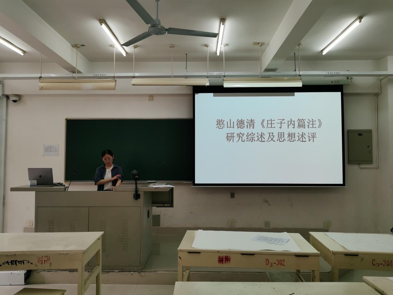 在“憨山德清《庄子内篇注》研究综述及思想述评”的读书报告中,余敏同学首先以“憨山在《论教乘》中的三教关系判定”为出发点,展开了论述,并得出佛家理论更为根本,是高出“世间法”的,而儒道理论终究只是世间法的结论。随后,余敏同学对《庄子内篇注》进行了阐释与解读。在引用了王红蕾的《缘起与本根:佛教与道教宇宙观的冲突与调和》,以及尚建飞的《以佛法验证“老庄之大言”——释德清诠释老庄思想的进路及其特点》两篇论文后,得出憨山德清对《庄子》中的根本性具体概念进行的佛学化改造这一结论。紧接着,余敏同学就《庄子内篇注》的成书年代进行了研究,并得出结论:其一,1620年是憨山《庄子内篇注》成书的关键时间点;其二,憨山注庄的开始创作时间早于《道德经解》这一说法只是一家之说;其三,《庄子内篇注》的成书非一时之功。最后,余敏同学对憨山德清《庄子内篇注》的思想进行了述评,并从以下几个方面进行论述。其一,内篇次序及其间的体用关系;其二,“真宰”与物论之齐;其三,“真宰”与养生全性。并得出“得道之真者不执着人我是非,其气象则是‘广大自在’的逍遥境界”的结论。