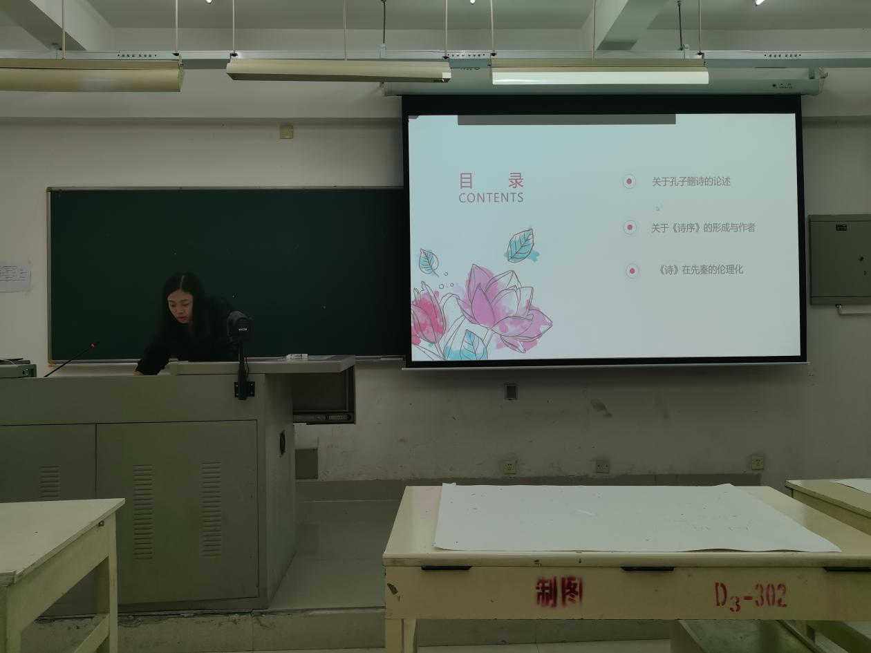 张晓丹同学的汇报题目为——关于《诗》的几个问题。首先,张晓丹同学论述了关于孔子删诗的主题,并从“孔子有正乐之功,而无删诗、编《诗》之事”以及“孔子有删诗、编《诗》之事”两方面进行了阐发。其次,张晓丹同学阐发了关于《诗序》的形成与作者这一主题,并列举了六家不同的观点,并最终得出“传世《诗序》的作者,很可能是子夏”这一猜测。最后,张晓丹同学介绍了《诗》在先秦的伦理化进程这一主题,并以诸子学角度进行了分析。