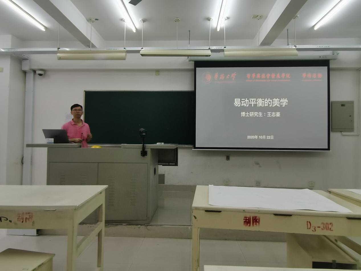 王志豪同学汇报的主题是——“易动平衡的美学”,并以生动有趣的方式介绍了《易经》中的美学概念。王志豪同学认为,“易动平衡的美学”概念,即自易学中所萃取的“易经美学”的理论框架,源于《易传》与“河图洛书”,从中衍生出一种广义的美学概念。并以此出发点, 探讨了这一中国固有的美学概念。从河图洛书到太极图,从直线到曲线,从复杂到简易,王志豪以“书不尽言,言不尽意”这一韵味无穷的古文结束了自己的汇报。