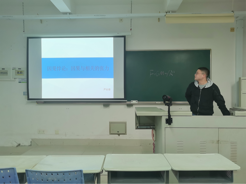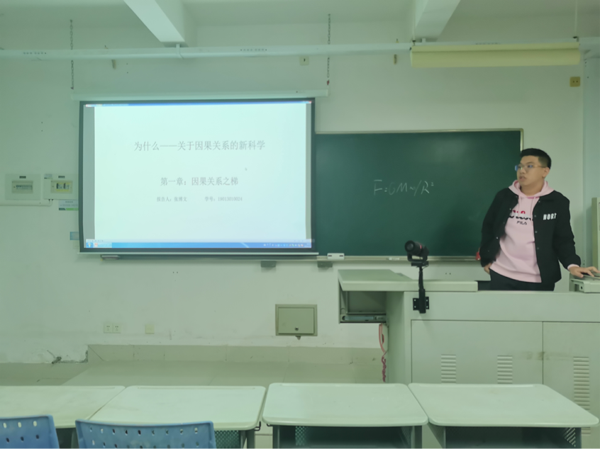 最后,张博文同学对书籍《为什么—关于因果关系的新科学》中第一章“因果关系之梯”展开汇报。该同学重点提出作者认为因果关系的学习者必须熟练掌握至少三种不同层级的认知能力:观察能力、行动能力和想象能力。第一层的观察能力,具体而言是指发现环境中的规律的能力。第二层级所体现的另一个热门问题是:“怎么做?”它与“如果我们实施…行动,将会怎样”是同类问题。第三层级的典型问题是:“假如我当时做了…会怎样?”和”为什么?“两者都涉及观察到的世界与反事实世界的比较。仅靠干预实验无法回答这样的问题。 最后,针对张博文同学,黄俊维老师认为,张同学的问题在于他只是对于书本的一小部分的介绍,但是这一部分也不是本书中重要的内容。同时,黄老师认为黄同学要注意学术报告的基本形式。最后,黄老师指出这些报告的东西既不能作为综述,也不能作为毕业论文。