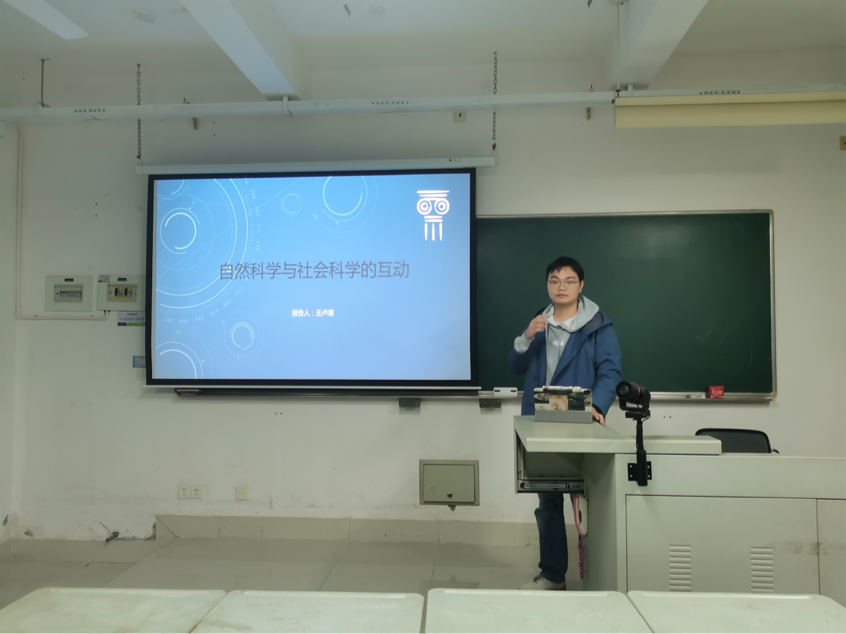 紧接着,王卢清同学对书籍《自然科学与社会科学的互动》做读书报告,首先,同学对作者伯纳德•科恩和书本的写作动机进行简要介绍。其次,从自然科学与社会科学的定义与划分;互动的类型:决定性成分与限定性因素;互动的四个层次:同一性、同源、类比、隐喻;不当和无用的互动这四个层面进行汇报。最后,王同学指出科恩在本书后的访谈中提到的自然科学与社会科学的互动,是由科学家与社会科学家们对于真与善的共同追求所驱动的,该同学认为社会科学从与自然科学的互动中将自然科学的实用性也附加到了自己的身上,实用价值反而成了科学家与社会科学家们所共同追求的东西,尤其是在自然科学及其实用价值突飞猛进的这些年,社会科学的学者也把自己研究对实用价值的追求抬高到了一个无以复加的地位,我们在着急回应我们所属的时代问题时候,也能够像古希腊哲学家做一些“没有意义”地、仰望星空地思考,找回那种真与善的追求。针对王卢清同学,黄俊维老师认为,报告应该要像书本一样,具备一些框架结构。此外,针对“互动的四个层次”这一页PPT,黄老师认为要举一些更加生动的例子,同时要删掉一些不必要的文字说明。总体来说,黄老师认为王卢清同学的汇报比较成功。