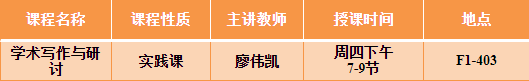 教学(教师主讲23-24学时)、讨论及实践(含选题、期末论文报告、研讨等,共计28-30学时)并重,并将邀请校内外专家学者分享学术写作经验(2-3学时)。