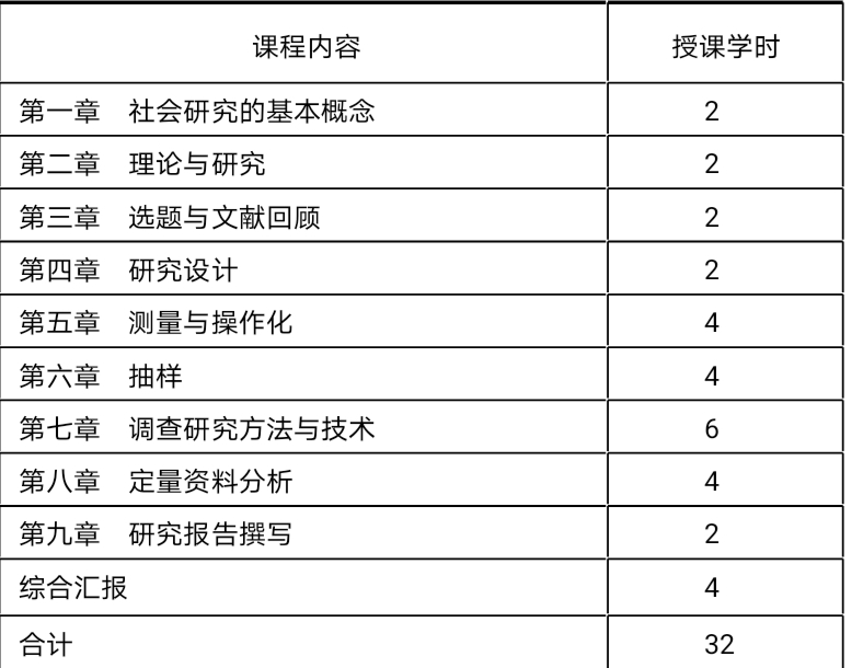 1. 以课堂讲授为主,阐述社会调查研究方法的概念、基本原理、基本方法及其在实践中的基本应用,为学生了解社会、认识社会奠定必要而良好的方法基础。