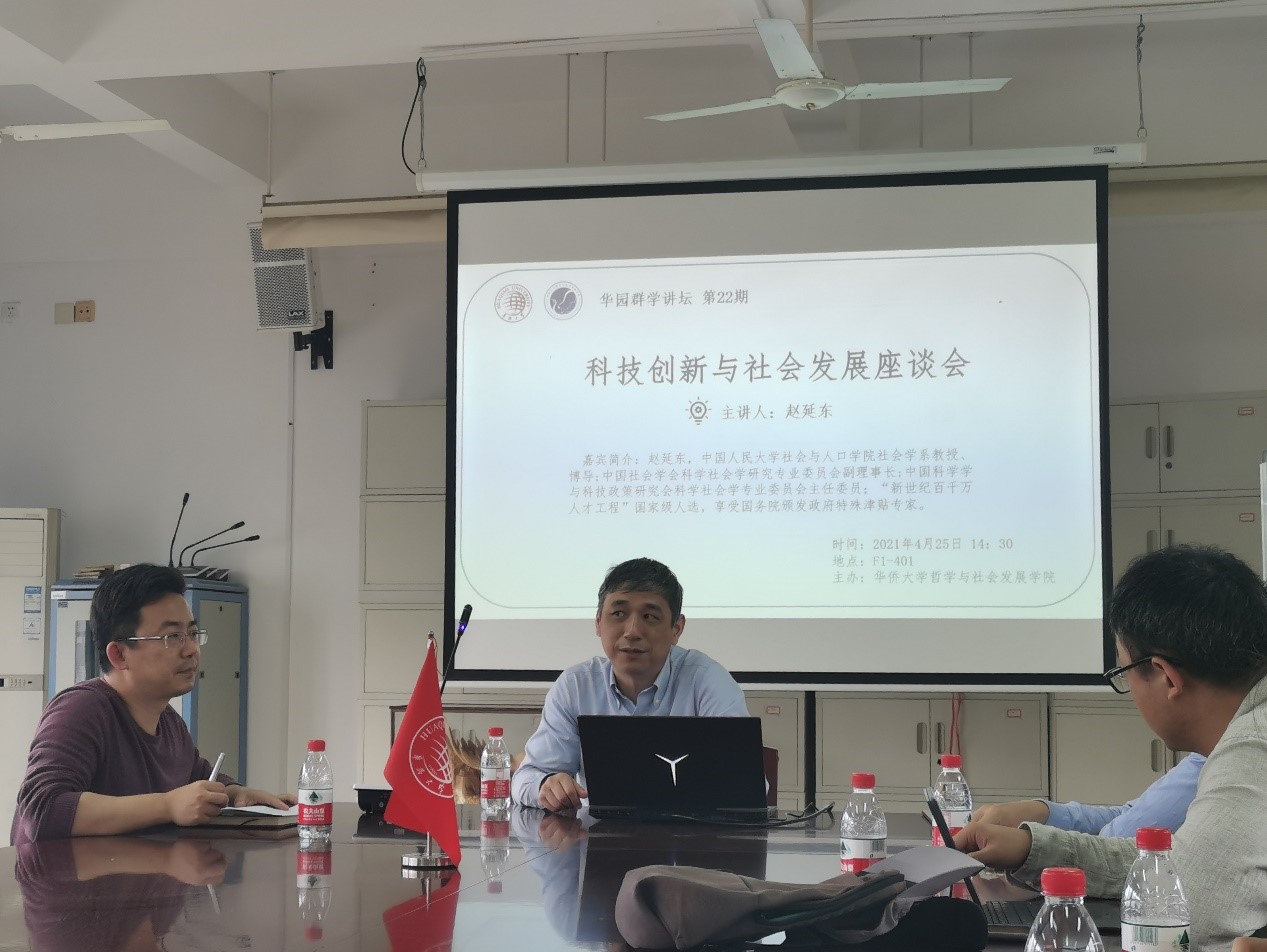 2021年4月25日,中国人民大学社会与人口学院社会学系教授赵延东应邀莅临我院讲学,于F1-401开展题为科技创新与社会发展的座谈会。活动由副院长王嘉顺主持,社会学系教师林少真副教授、郭荣茂副教授和邵岑副教授参加座谈。