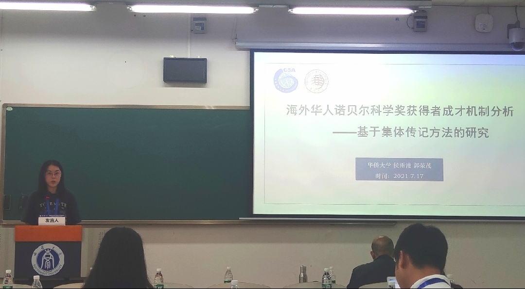 此次论坛共分四场,共发表18篇论文。四场研讨气氛活跃、反响热烈,与会者就每篇学术论文的内容与观点展开了充分而深入的讨论和交流,生动展示了“社会学视野下的华侨华人”研究的理论高度、视野广度、思想深度和人文温度。我院2018级本科生侯雨潼在此次论坛发表《海外华人诺贝尔科学奖获得者成才机制研究——基于集体传记方法的分析》一文。