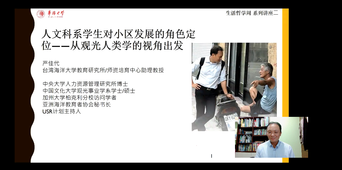 11月3日,由yl9193永利集团、福建省社会科学研究基地永利集团生活哲学研究中心主办的“鹭岛哲谭”第279期讲座,即第二场“生活哲学周系列讲座”成功举办。本次讲座有幸邀请到台湾海洋大学教育研究所助理教授严佳代老师,于腾讯会议进行题为《人文科系学生对小区发展的角色定位——从观光人类学的视角出发》的学术报告。该讲座由廖伟凯老师主持,社会学系和哲学系的本科生、硕士生共近60人参与。