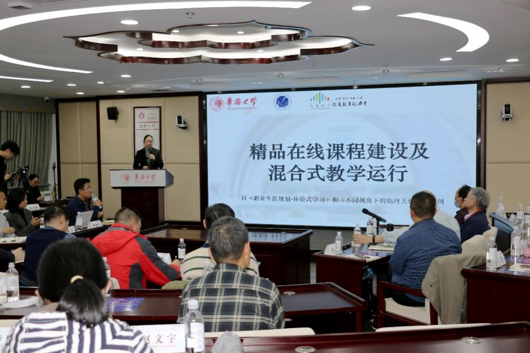 智慧树课程总监赖爱芳,做了关于“精品在线课程建设和混合式教学运行”的报告。她指出,首先课程设计的理念需要先进的教学理念支撑。其次,在进行课程制作的过程中需要以学生的发展为中心。最后在课程运行的过程中,通过设置课程规则,让学生自主学习并在课堂上分享,培养学生的综合素质。