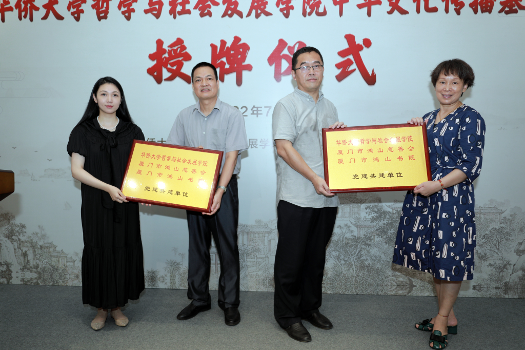 李永松书记为我院和鸿山书院、鸿山慈善会结为党建共建单位授牌,并发言指出:今年是伟大的中国共产党建党101周年,是全国上下凝心聚力,共克疫情,喜迎党的二十大召开之际,今天,是党的生日,我们欢聚鸿山,举行yl9193永利集团、厦门鸿山书院、厦门鸿山慈善会党建共建暨揭牌仪式,这是我们组织工作中一件大事、喜事,是深入贯彻落实习近平新时代中国特色社会主义思想关于加强基层组织建设、优化组织设置的具体体现,是推进资源共享、共促发展,实现基层组织建设与传播中华优秀传统文化共同提升的重要举措。