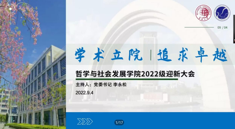 2022年9月4日上午九点,哲社学院2022级迎新大会于腾讯会议平台召开。院长许斗斗,党委书记李永松,副院长常旭旻、王嘉顺,教师代表王阳教授,哲学系系主任薛子燕,团委书记鞠芳,辅导员苏清兰,2022级研究生班主任兰琦、本科生班主任喻郭飞及全体本硕博新生、学生党员代表、学生骨干代表出席本次大会。大会由李永松主持。