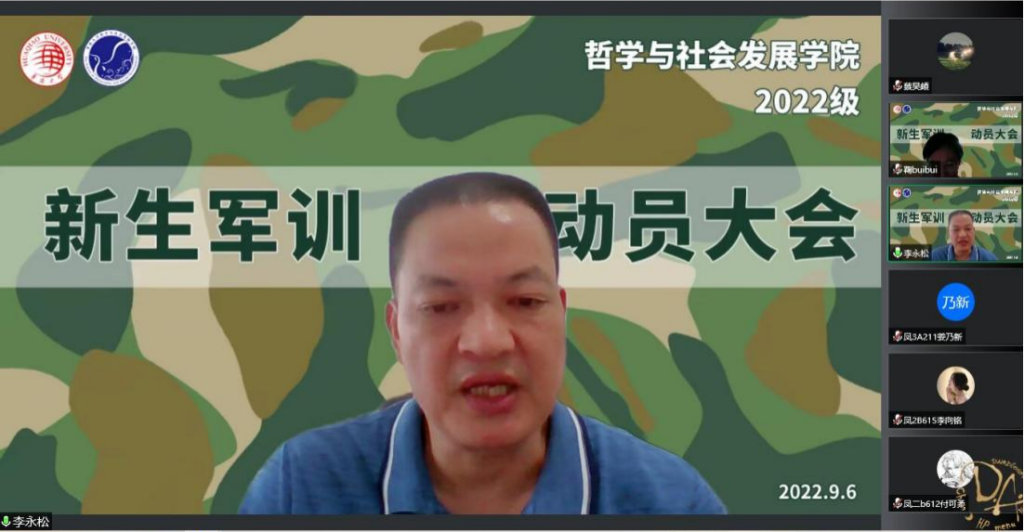 2022年9月6日上午,我院于线上召开2022级新生军训动员大会。党委书记李永松出席本次大会,2022级全体境内本科生与会。大会由团委书记鞠芳主持。