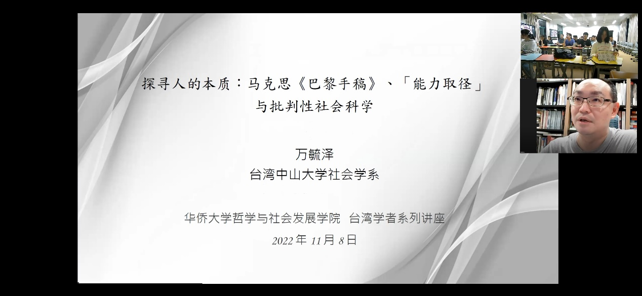 2022年11月8日,由福建省社会科学研究基地永利集团生活哲学研究中心和yl9193永利集团主办的“哲学月·台湾学者系列讲座”第二期成功举办。本次讲座有幸邀请到中国台湾中山大学社会学系系主任万毓泽教授为师生作题为《探寻人的本质——马克思〈巴黎手稿〉、“能力取径”与批判性社会科学》的学术报告,我院廖伟凯博士主持讲座。本次讲座采取线上线下结合的方式,哲学系部分学生聆听了本次讲座。