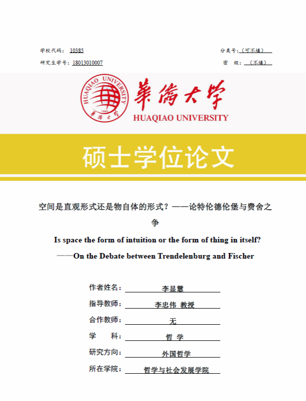 一篇优秀的硕士论文应该展现作者独立寻找和解决具有一定挑战性的学术问题的能力。李显慧同学选择了早期新康德主义中(特伦德伦堡、费舍)关于康德哲学中空间形式的一个重要争论进行研究。该选题难度较大,国内学者鲜有涉猎,完成这一选题需要处理大量一手和二手德语和英语文献,但最终作者梳理出了较为清楚的线索,且阐明和辩护了作者对该问题的独立学术判断。不足之处在于应进一步给出其当代理论蕴含。综合而言,李显慧同学的毕业论文文献充实,行文清晰,引证规范,有一定创见,是一篇优秀的硕士学位论文。