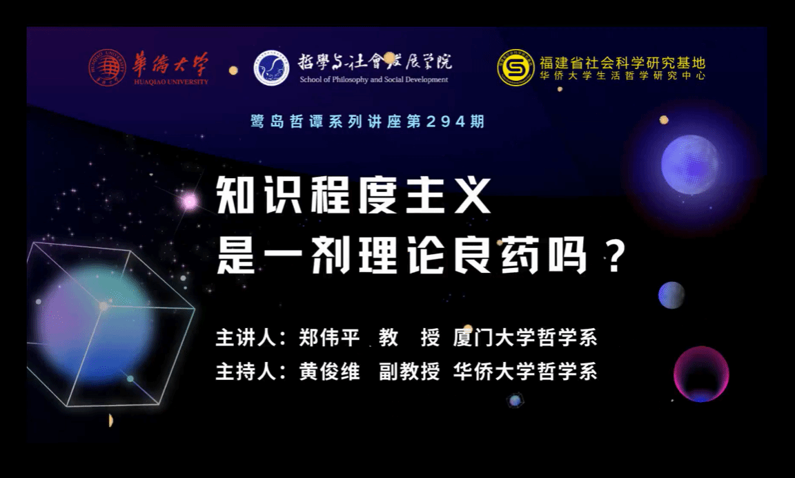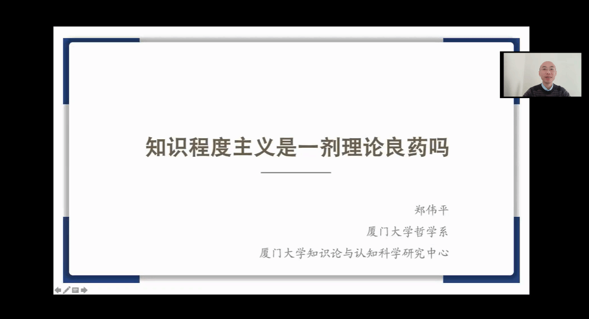 2022年12月14日晚,福建省社会科学研究基地永利集团生活哲学研究中心和yl9193永利集团有幸邀请到厦门大学哲学系郑伟平教授作题为《知识程度主义是一剂理论良药吗?》的学术讲座。据悉,本次讲座系鹭岛哲谭系列讲座第294期,采用线上报告的形式,由永利集团哲学系黄俊维副教授主持。哲学系廖伟凯博士、本科生与研究生40余人聆听了本次讲座。