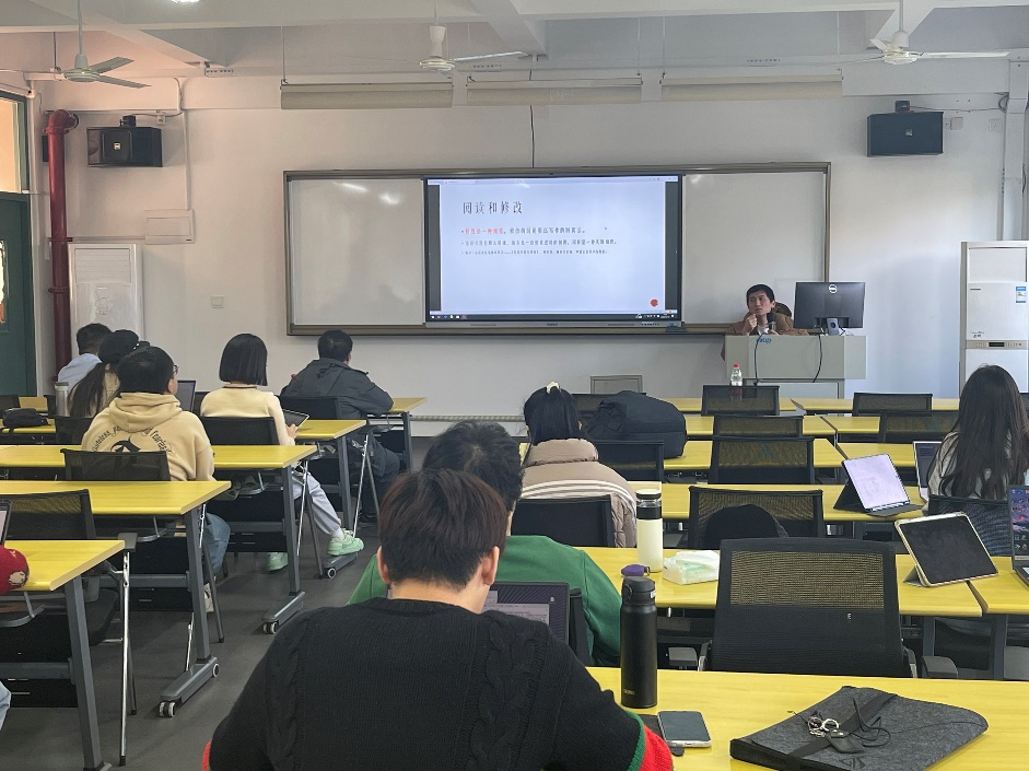讲座伊始,刘君老师对写作理论的成型伴随着的五个转变进行了介绍,这些转变分别是时代转变、研究方向转变、写作方式转变、训练方式转变以及编辑评价标准的转变。其次,刘君老师对阅读方法进行了详细讲解,他指出,阅读过程中不能局限于一次解读,而是要进行二次解读至多次解读。最后,刘君老师分别讲授了什么是有力论证、训练的方法、阅读和修改等问题。